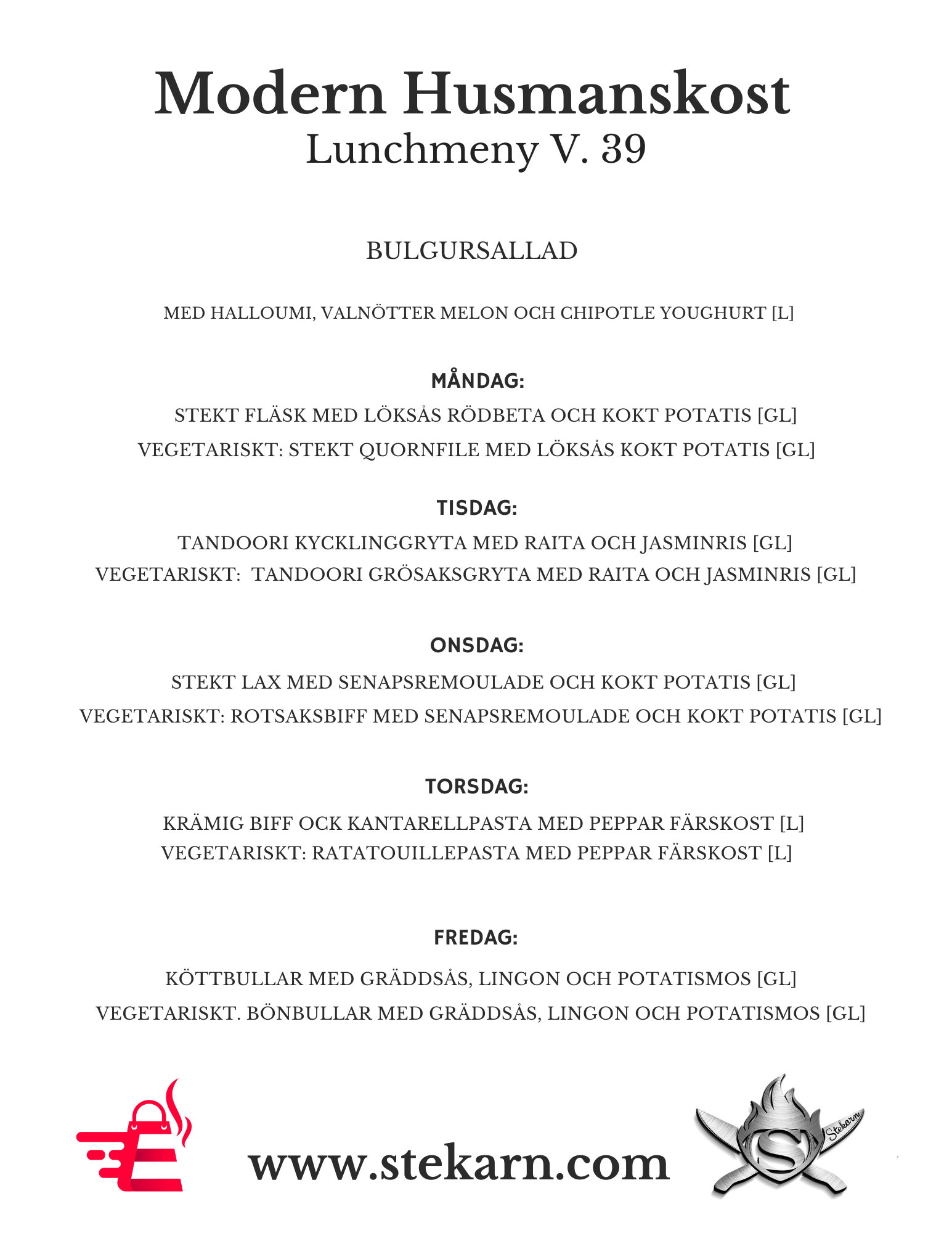Stekarn lunchmeny vecka 39 Åland företagslunch Stekarn E-Meal Hämtmat www.emeal.ax Av Stekarn Ab | 23 september, 2021 Stekarn lunchmeny vecka 39 Åland företagslunch Stekarn E-Meal Hämtmat www.emeal.ax